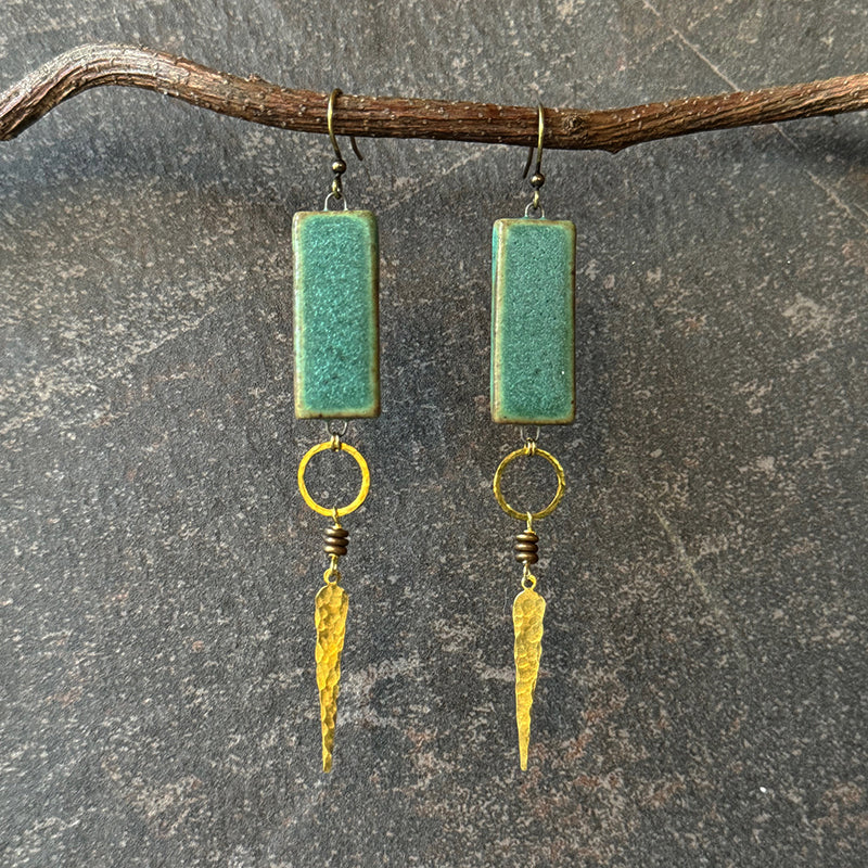 Handmade ceramic matte moss green rectangles, layered brass, and brass points. These magic earrings have great movement. Pottery shape made from high-fired stoneware clay. Brass points create eye catching shine at the bottom of theses earrings. .